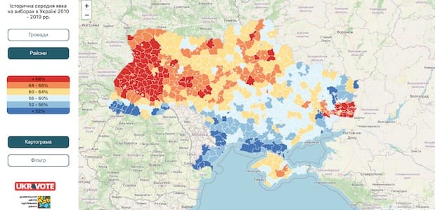 Далі середня явка на виборах. Що тепліший колір, то більшою була явка в цих районах. Тут видно для яких районів історично були важливі результати загальнодержавних виборів.