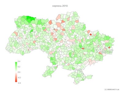 Візьмемо наприклад карту динаміки зміни населення за 2010 рік. У серпні більшість районів країни зелені – тобто кількість населення в цих районах зростає, а от у жовтні майже вся країна червона – райони втрачають населення.