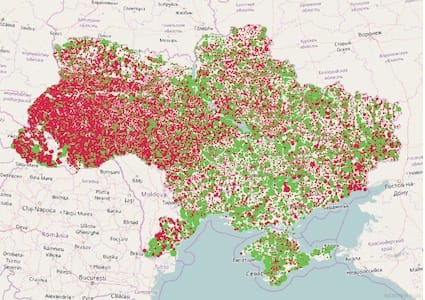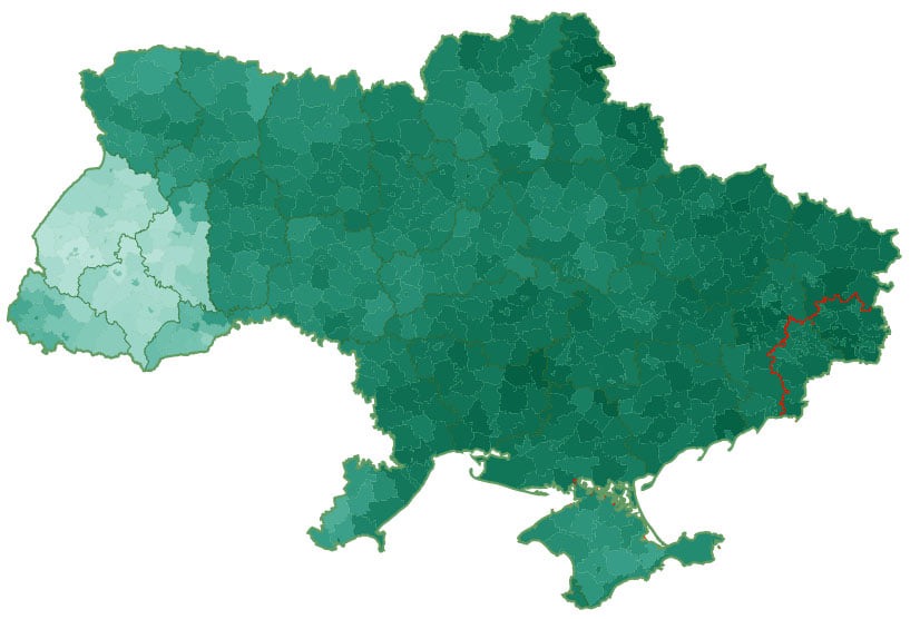 А ось цікава карта в контексті виборів. Тут можемо побачити доволі полярні “фланги”, але найцікавішими є громади виділені червоним кольором. Вони майже завжди голосують за переможця. Тобто за цими громадами можна передбачити як проголосує країна в цілому. Вони розташовані на півночі, центрі і півдні України.