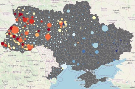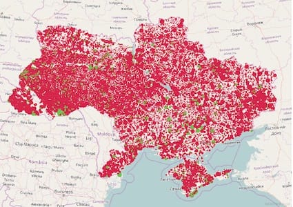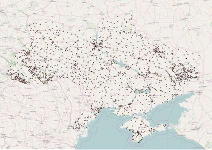 Що зображене на наступній карті майже неможливо здогадатися без пояснення. Тут цятками вказані населені пункти де проживає менше 25 людей. Чим пояснити таку концентрацію мікроскопічних населених пунктів у трикутнику Полтава-Харків-Суми важко казати. Цікаво, що в Чернівецькій області такий населений пункт лише один.