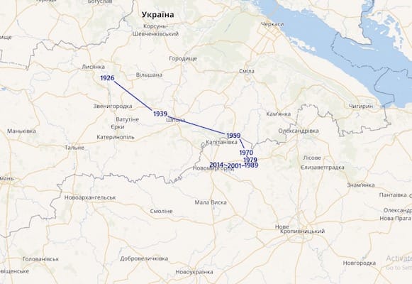 А це рух центрів мас населення України з 1926 року.