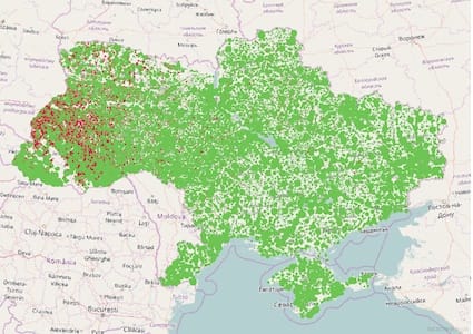 А на цій карті зображені населені пункти з населенням понад 3000 осіб. Окрім типових скупчень навколо великих міст і попри головних магістралей, видніються також скупчення містечок Донбасу, а також прикарпаття та закарпаття, що може здатися доволі несподіваним.