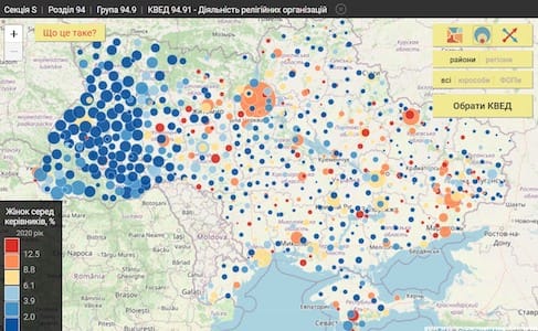 Наступна карта показує як розподіляються за статтю керівники релігійних організацій України. Тут бачимо цікавий тренд на заході України, де керівниками релігійних організацій майже винятково є чоловіки.